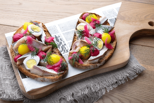 Smørrebrød is a traditional Danish open sandwich filled with a wealth of flavors and textures. The history of this dish goes deep into Scandinavian gastronomy when fish and root vegetables were the staples of the diet. In this version of smørrebrød, rye bread is toasted to a crispy crust and then layered with tender potatoes, cream-cured herring, aromatic beet sauce, and red onion. The composition is complemented by quail eggs, fresh radishes, and dill sprigs, creating a harmony of flavors. Drizzled with fragrant unrefined oil, this sandwich surprises with its combination of salty, sweet, and spicy. Smørrebrød is not just a snack but a true gastronomic experience.