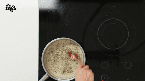 When the mixture starts to darken, add milk and mix thoroughly with a whisk. If the sauce is too thick, add a little milk. When the sauce thickens, add sour cream, stir, and remove from heat.