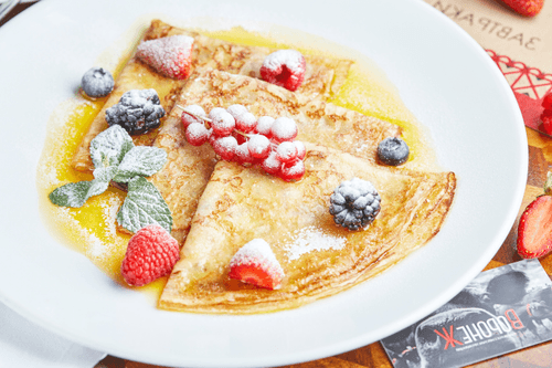 Pancakes with caramel-orange sauce and fresh berries are an exquisite dish inspired by the refinement of French cuisine. Delicate, airy pancakes soaked in fragrant citrus sauce create a harmony of sweetness and light tartness. The thick caramel-orange glaze slowly drizzled over the hot batter envelops it in rich flavor. Fresh berries add brightness, balancing textures and giving each serving a refreshing touch. This is the perfect treat for a morning breakfast or an elegant dessert that highlights the solemnity of the moment. The recipe combines classic pancake-making techniques with the fine art of sauce creation, transforming an ordinary dish into a culinary delight.