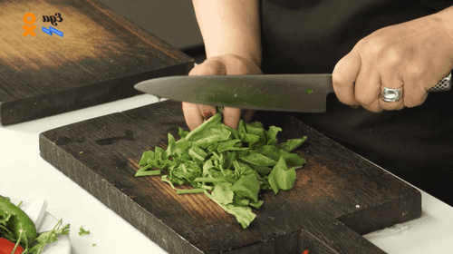 Chop the sorrel coarsely and the other greens finely. Instead of sorrel, you can use spinach or a mix of half sorrel and half spinach; you can also use parsley, tarragon, beet greens, chard (which are also beet leaves), green onions - basically any greens to taste and availability. Slice the chili pepper (green is needed for harmony) into thin rounds. Mince the garlic.