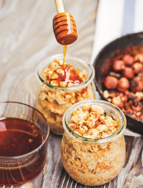 In the morning, take it out of the fridge, drizzle with honey, and sprinkle with nuts for a tastier crunch if needed. Enjoy the overnight oats cold or heat in the microwave for 30-60 seconds.