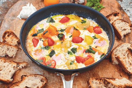 The recipe is taken from the book "Jamie Cooks Italy" by Jamie Oliver. "This is a fantastic starter and a great breakfast! It's easy to make: just throw everything in the pan and it's ready to serve. The melted mozzarella is mixed with tomatoes, and the eggs in this environment turn out incredibly tasty. You'll definitely like it!"