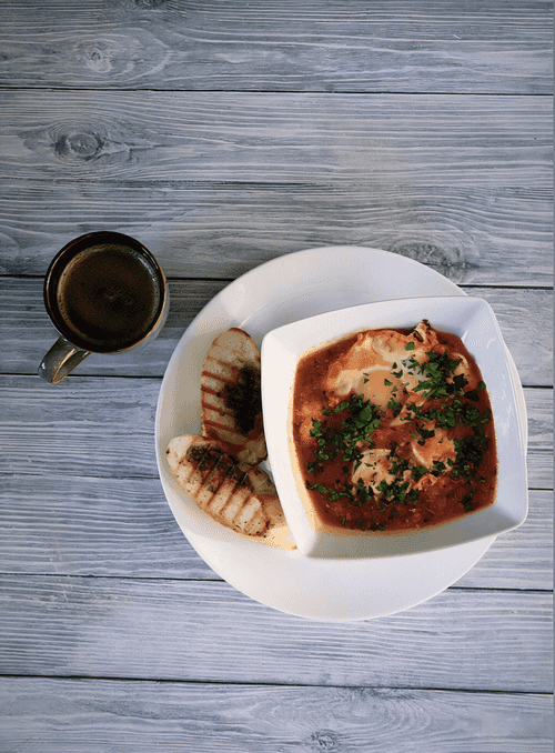 Spicy shakshuka with chickpeas is a vibrant and aromatic dish from Jewish cuisine that combines spicy spices, rich tomatoes, and tender eggs. It originates from traditional shakshuka but adds chickpeas for extra texture and nutrition. The mild heat of chili and cumin pairs beautifully with the creaminess of mozzarella cheese, creating a harmonious balance of flavors. Shakshuka is cooked in a deep skillet and often finished with a brief bake in the oven to keep the eggs slightly runny. This dish is perfectly complemented by crispy bread that soaks up the flavorful tomato sauce. It’s suitable for a late breakfast, lunch, or even dinner, offering rich taste and a cozy Mediterranean atmosphere.
