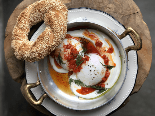 Turkish scrambled eggs with yogurt sauce and simit bun