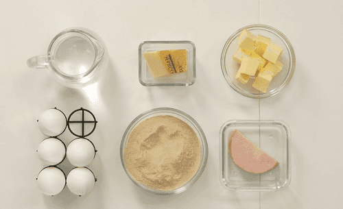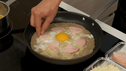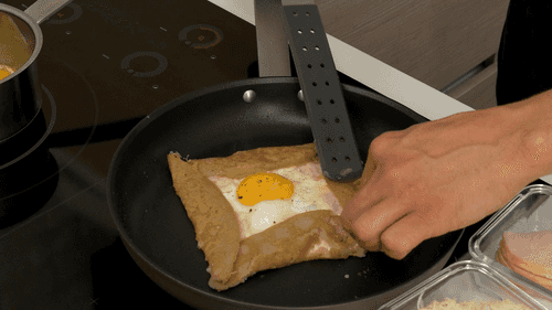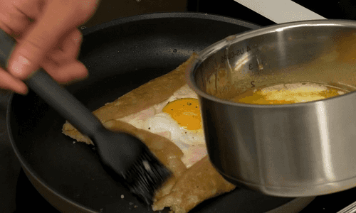 Fold the edges of the pancake to the center so that the yolk remains visible. Fry for another minute and brush the edges of the galette with melted butter. Repeat the procedure with the remaining batter and other ingredients.