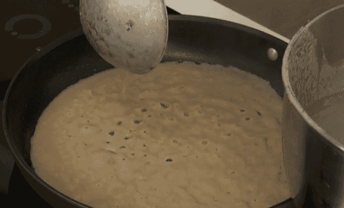 Pour a little batter, turning the pan in circular motions to cover the entire bottom surface with a thin layer.