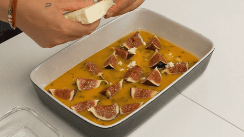 Grease a heatproof dish with oil, pour in the eggs, add pieces of feta and fig. Place in an oven preheated to 180 degrees for 15-20 minutes.