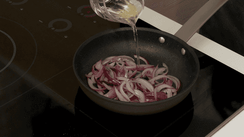 Slice the onion into thin strips, fry in sunflower oil with a pinch of salt for a couple of minutes, then add wine and evaporate it, add some brown sugar and fry on low heat, stirring constantly until the onion becomes soft and caramelized.