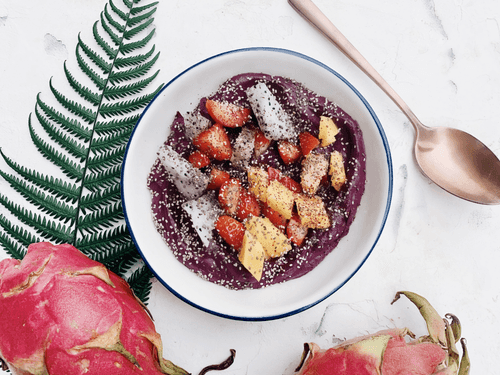 Place berry puree, avocado, peanut paste, and acai in a blender and blend until paste-like consistency. Transfer to a deep plate.