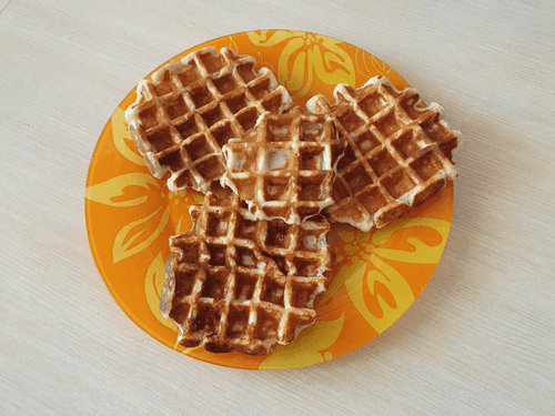 Bake waffles in a preheated and greased waffle maker (if unavailable, they can be baked as pancakes in the oven or fried in a pan).