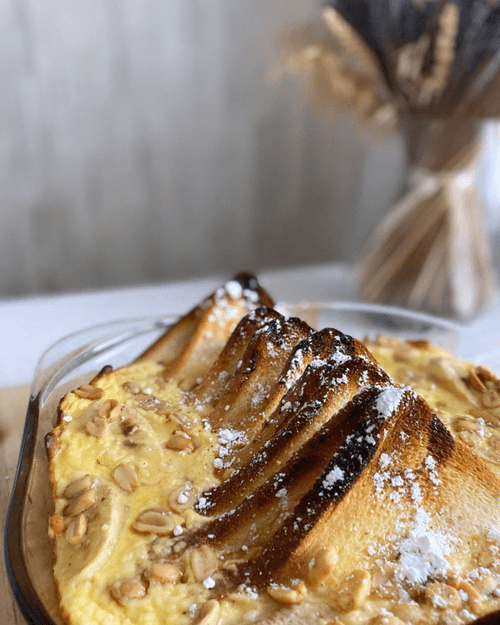 French toast with liqueur is a refined blend of classic breakfast and exquisite dessert. This recipe, inspired by French culinary traditions, offers the creaminess of cream cheese, the tenderness of honey, and the spice of cinnamon, while Baileys liqueur adds a sophisticated note. Baked bread soaked in an aromatic mixture pairs with caramelized bananas to create a rich and harmonious flavor. Crunchy nuts add texture, and powdered sugar finishes the composition with a light sweetness. It's the perfect dish for a cozy breakfast or late brunch when you want to treat yourself to something special.