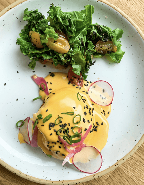 A recipe from Maxim Sorokin, chef of the restaurant "Soyka Napela". Tropical notes appear in this unusual presentation of a classic breakfast. The sweet potato gives the pancakes a sweetish taste, so it seems that some exotic fruit has been added to them. And the scattering of sesame seeds on the glossy surface of the reddish-turmeric mayonnaise looks like passion fruit pulp.
