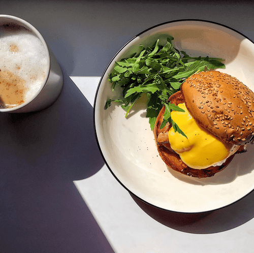 Prepare breakfast. Bun, bacon, poached egg, sauce, bun and add greens for beauty and freshness.