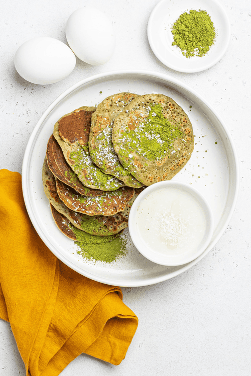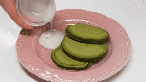 Matcha pancakes with coconut condensed milk