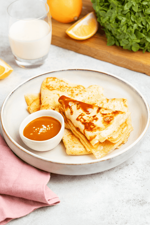 Pancakes with salted caramel are an exquisite combination of airy thin pancakes and rich, velvety caramel sauce with a hint of sea salt. This dessert originates from Russian cuisine, where pancakes symbolize hospitality and family celebrations. Salted caramel adds a refined depth of flavor to the dish, balancing the sweetness of the caramel with a gentle salty note. The pancakes are tender with a slight crispy crust that perfectly absorbs the aromatic caramel sauce. They can be served as an independent treat or as an addition to breakfast or festive table. They pair excellently with a cup of strong coffee or fragrant tea, creating a unique atmosphere of coziness and enjoyment.