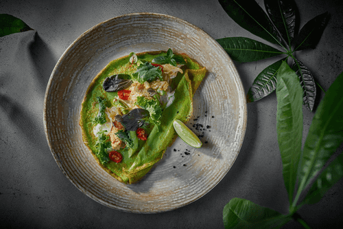 Mix eggs, vegetable oil, cream, milk, flour, salt, spinach juice, and sugar in a bowl and whisk well.