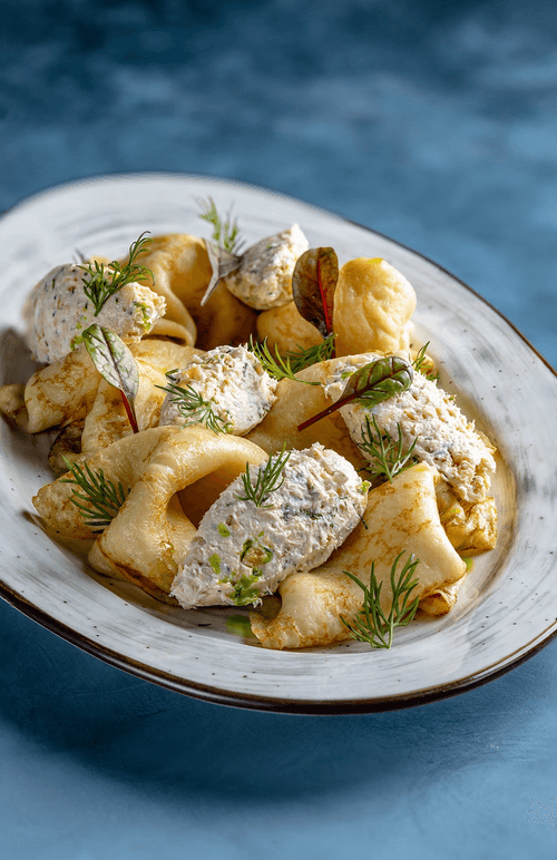 Place cheese and sliced salmon on top of each pancake and garnish with greens.