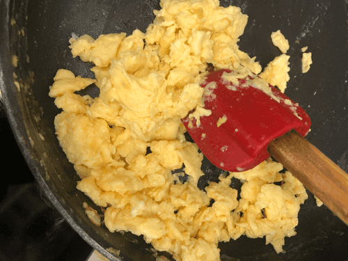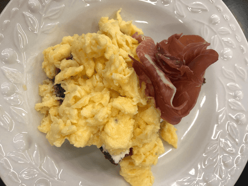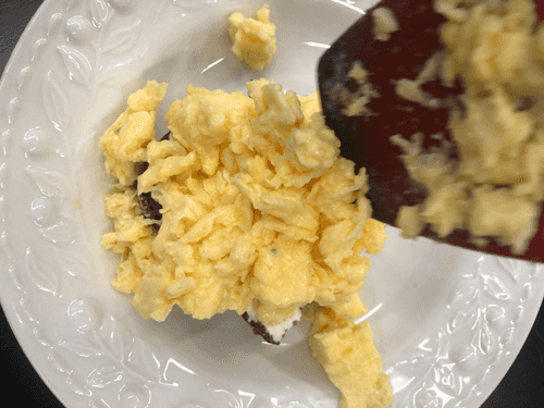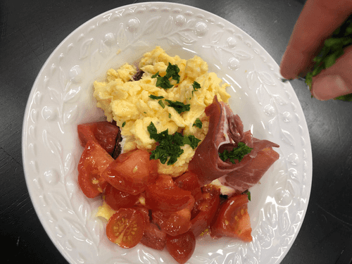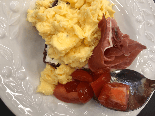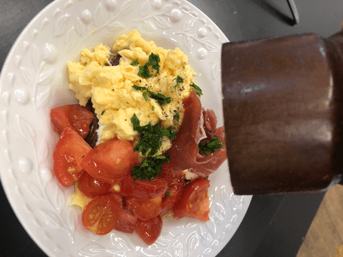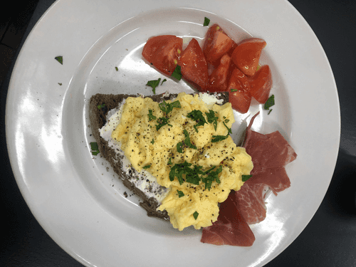 Scrambled eggs with toast and ham is a refined blend of Italian gastronomy and morning tenderness. The airy egg mixture, cooked in a blend of butter and sunflower oil, acquires a rich, intense flavor. Rye toast with cream cheese adds textural harmony, while the ham brings a subtle salty note. Fresh pink tomatoes refresh the dish's palette, and parsley completes the picture with Mediterranean aromas. Black pepper delicately highlights all the flavor nuances. This breakfast is not only nutritious but also aesthetically pleasing, creating an atmosphere of morning enjoyment.
