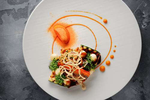 Serve portioned on a plate as follows: pumpkin puree around the edge, zucchini on top, bulgur in the center, and fried carrots and onions on top. Drizzle with vegetable demi-glace and garnish with herbs and cress.