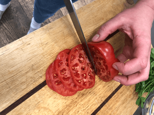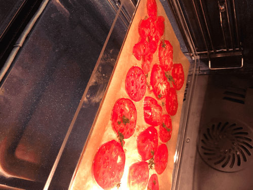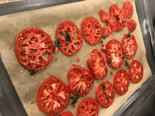 Place the tomatoes on baking paper, season with salt and pepper, and add sugar to taste. Optionally, add fresh herbs. Drizzle with vegetable oil.