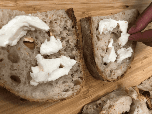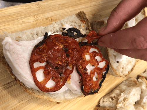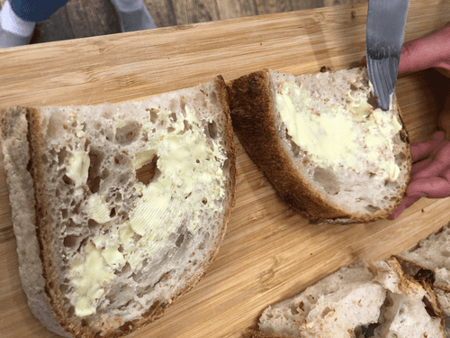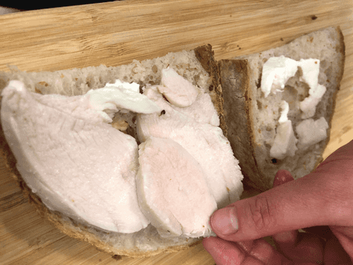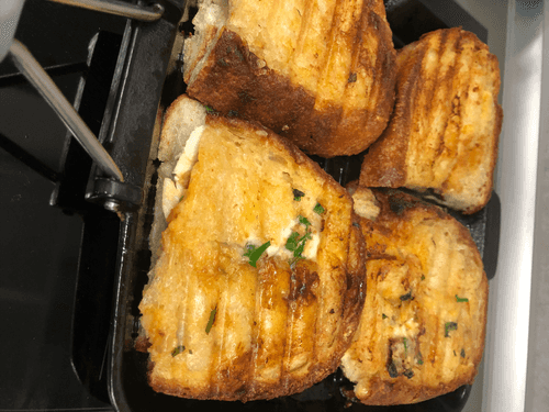 Add pieces of mozzarella to the unbuttered side of the bread.