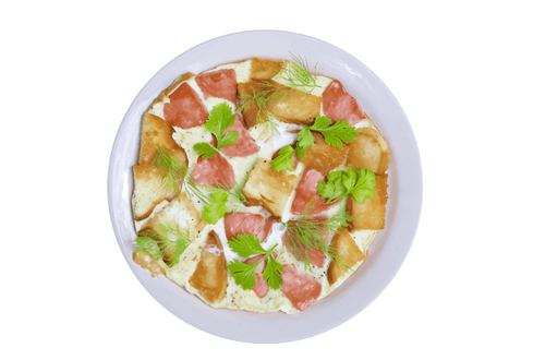 Omelet with croutons and sausage is a simple yet surprisingly delicious dish from Yugoslav cuisine. The recipe is based on airy eggs, crispy pieces of golden bread, and flavorful boiled sausage that adds richness to the taste. A light hint of onion enhances the dish's texture. This omelet resembles traditional village breakfasts where simple ingredients turn into a true gastronomic find. It can be served with ketchup or sauce, adding zest to each bite. Such an omelet is perfect for a quick, hearty, and warm breakfast or dinner, creating an atmosphere of home comfort.