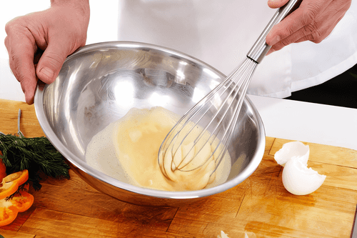 Mix eggs with milk (25 g), pour into a greased pan, steam until cooked, then cool and chop.