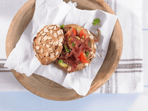 A German sandwich with dried meat is a refined and nutritious snack that embodies the traditions of German cuisine. It features a fragrant whole grain bun that adds rich flavor and pleasant texture to the dish. Dried beef, with its deep and rich taste, pairs wonderfully with sweet-and-sour pickled cucumbers and juicy cherry tomatoes. Parsley adds freshness, while salt and pepper enhance the main flavor notes. This sandwich is perfect for a quick snack, picnics, or a hearty breakfast. It requires no complicated preparation but can surprise with its harmony of flavors and sophistication of ingredients. Simplicity and quality are the main traits of this dish, which pairs perfectly with a cup of aromatic coffee or herbal tea.