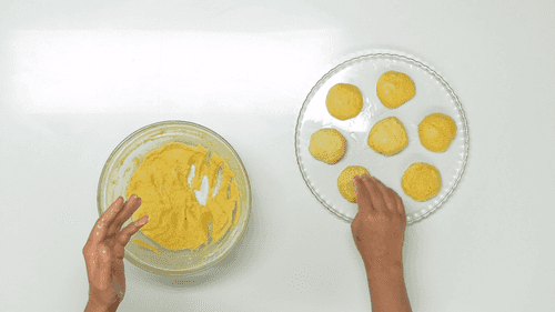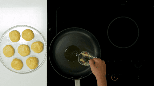 Moisten your hands with cold water to form round cheese pancakes from the swollen mass.