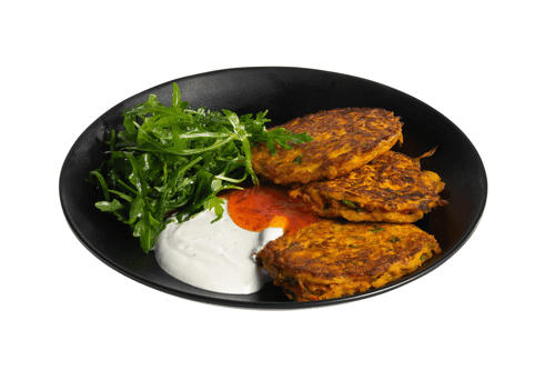 Carrot pancakes with salted yogurt are a wonderful combination of tenderness, freshness, and mild spiciness. This recipe is inspired by European cuisine, where the balance of flavors and textures is valued. Crispy carrot pancakes gain a rich aroma from cilantro and spices, while their airy structure resembles American pancakes. The salted yogurt as a sauce highlights the natural sweetness of the carrots, adding pleasant acidity and lightness. Arugula dressed with lemon juice and olive oil adds freshness to the dish, while sweet chili sauce adds spicy notes. An ideal choice for a light breakfast or an unusual appetizer. Each bite is a harmony of flavors where the sweetness of carrots combines with the saltiness of yogurt and the spiciness of spices, creating an unforgettable gastronomic impression.
