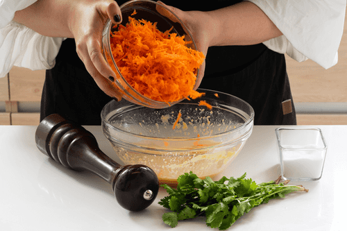 Add carrot, finely chopped cilantro leaves, salt, and pepper. Mix well.