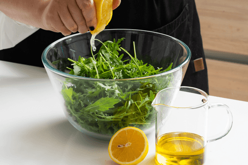 Dress the arugula with lemon juice and olive oil. Add salt and pepper.