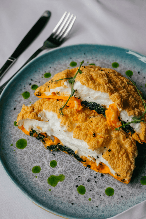 Remove the omelet from the pan, carefully cut it into pieces. Garnish with microgreens and green oil.