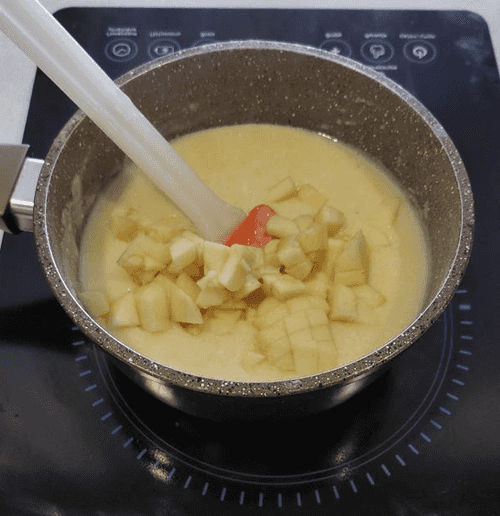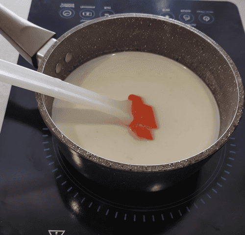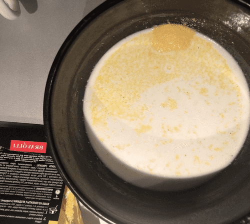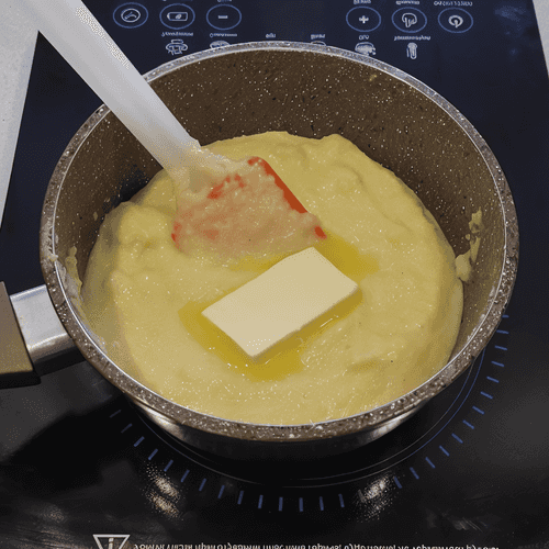 Pour water with milk and place on low heat, stirring constantly to avoid lumps.
