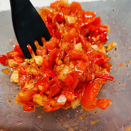 Mix pepper with tomatoes.