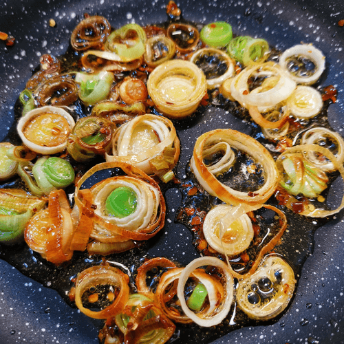 Heat oil in a pan with chili flakes and a pinch of coarse sea salt.