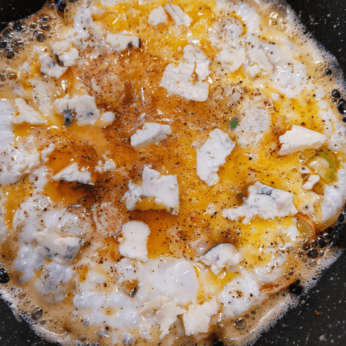 Cheesy scrambled eggs with leeks is a refined French dish that combines the airy tenderness of eggs with the savory depth of blue cheese and the light sweetness of leeks. This breakfast is worthy of a cozy Parisian morning and features a harmonious balance of flavors: the mild heat of chili pepper highlights the creamy notes of melted cheese, while sea salt enhances their richness. Such dishes are said to have originated in the French provinces, where simple yet exquisite combinations are appreciated. Leeks add a characteristic sweet freshness to the eggs, and thin slices of blue cheese give it noble softness. Serving this scrambled egg dish with a crispy baguette allows one to savor every bite of melted cheese and fragrant egg. The taste of this dish is morning inspiration, lightness, and comfort captured in a perfect blend of ingredients.