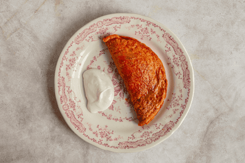 Fold the omelette in the pan, place it on a plate, and add sour cream.