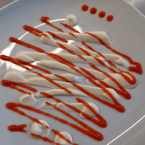 Grease the plate with mayonnaise and chili sauce in advance. Place the fried eggs as soon as the whites of the top eggs set.
