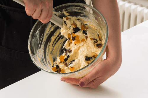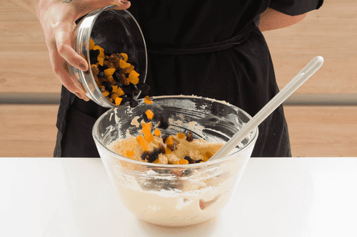 Add dried fruits. If they are hard, soak them in boiling water for 10 minutes first.