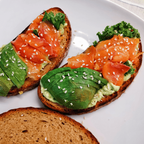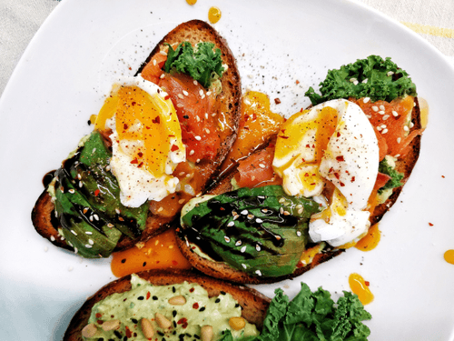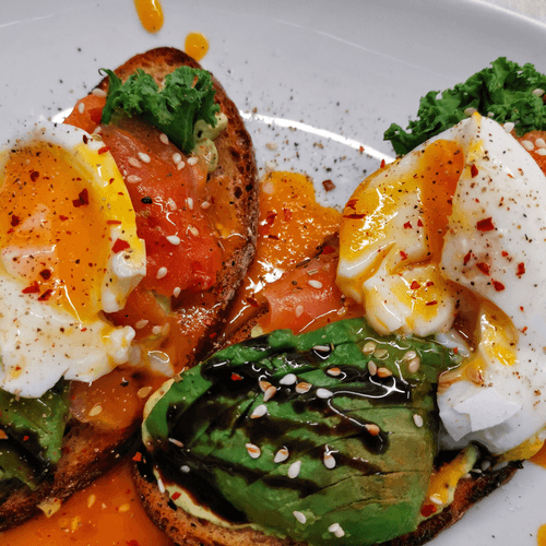 Bruschetta with avocado, salmon and poached egg