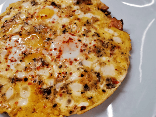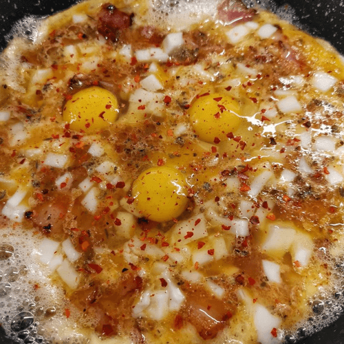 Eggs with bacon and suluguni cheese is a hearty and aromatic dish that combines crispy bacon, tender eggs, and stretchy suluguni. This dish has a signature character, merging classic Western scrambled eggs with Georgian cheese known for its elastic texture and milky flavor. During cooking, the bacon acquires an appetizing golden crust while the suluguni melts, creating a rich cheesy note. Italian herbs and chili pepper add spiciness, making the dish more expressive. The scrambled eggs are perfect for a late breakfast or cozy home dinner, especially with fresh bread and vegetables. This harmonious blend of flavors will appeal to lovers of simple yet exquisite dishes.