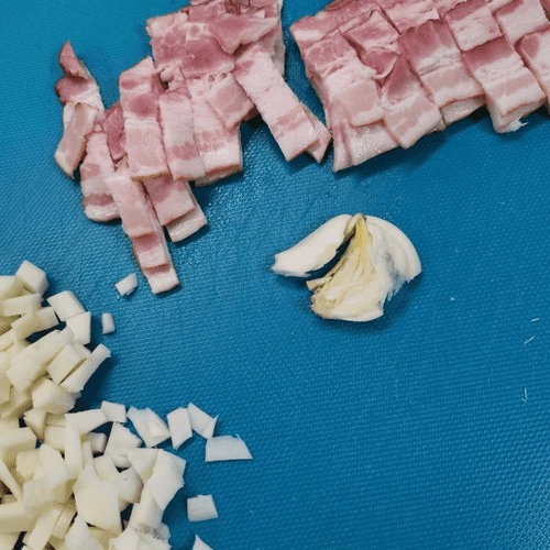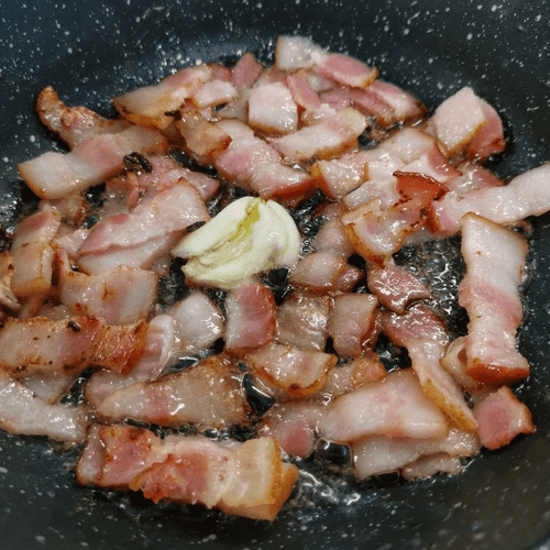 Fry the bacon in a dry pan with garlic for 5 minutes, stirring occasionally. Remove the garlic at the end.