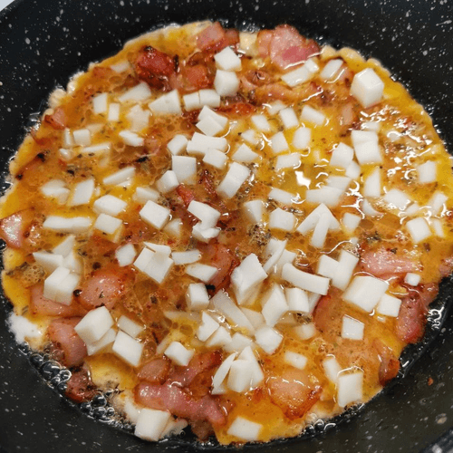 Pour the egg mixture over the bacon and sprinkle with suluguni cheese on top.