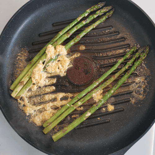 After 5 minutes, flip the asparagus and pour the sauce into the pan.