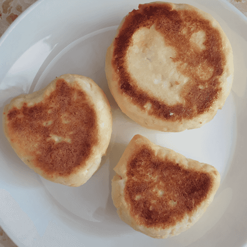 Sprinkle some rice flour on a flat plate for coating. Shape a round cheese pancake, coat it in flour, and give it the desired shape. You should get 8 cheese pancakes.