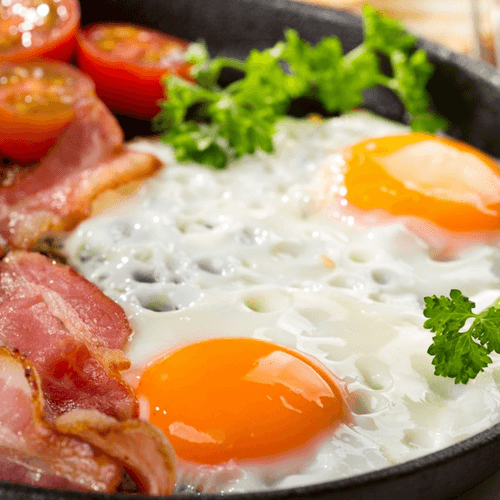 Place the fried eggs on a plate and serve with bacon. You can also add your favorite herbs to taste.