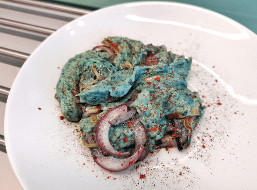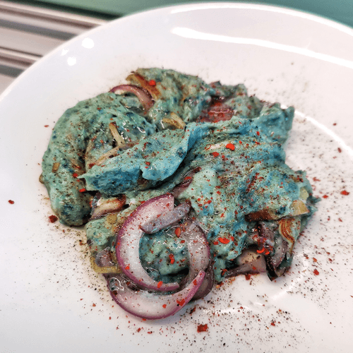 Скрэмбл с соком из красной капусты – это смелый и оригинальный рецепт авторской кухни, который привносит свежий взгляд на традиционный омлет. Красная капуста, богатая антиоксидантами и насыщенными оттенками, не только придаёт блюду нежный фиолетовый цвет, но и добавляет легкую сладковатую нотку во вкус. Лук-порей и красный лук обеспечивают тонкий аромат, а сливки делают текстуру воздушной и бархатистой. Подача с перцем чили добавляет пикантности, делая блюдо особенно выразительным. Идеальный вариант для утреннего завтрака или легкого ужина, который впечатлит своей необычностью и глубиной вкусовых ощущений.
