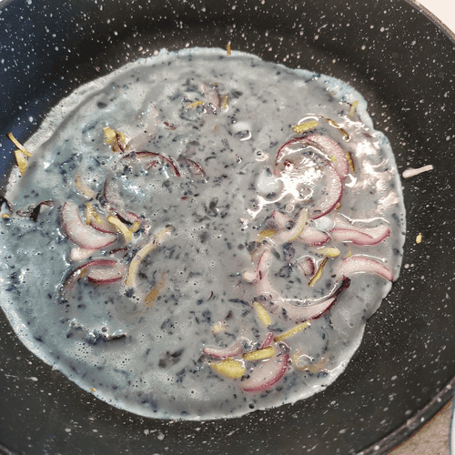 After a minute of frying the onion, stir it and pour in the mixture. Increase the heat.