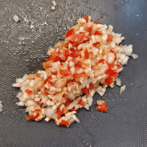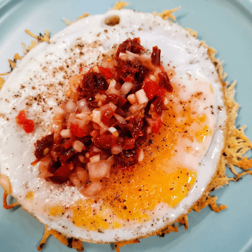 Combine the sun-dried tomatoes with the remaining tomato-onion-garlic mixture and place it on the fried eggs.